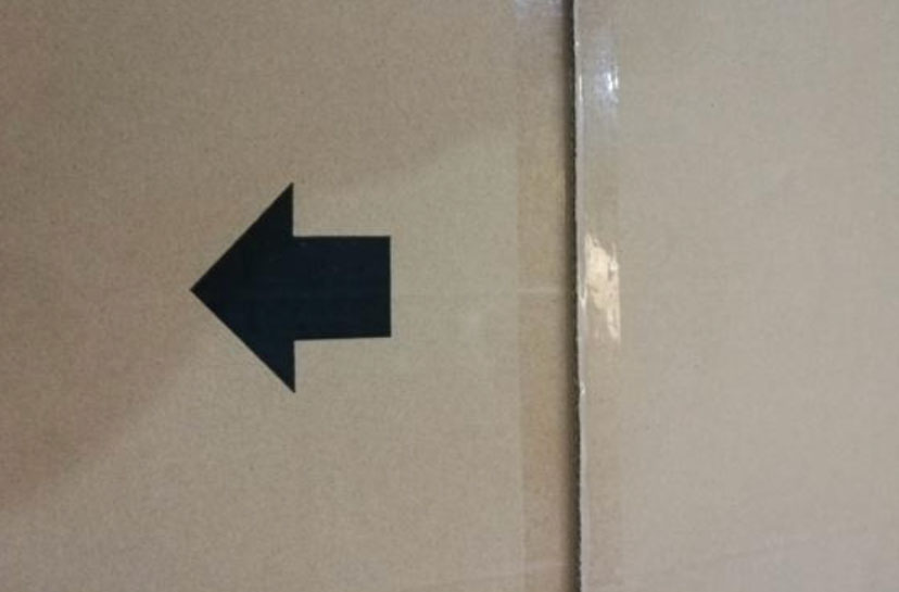 The direction indicated by the arrow on the carton is the front side of the subwoofer where the driver component is housed. There are perforated hand holds on either side of carton that you can use when trying to move this heavy piece.